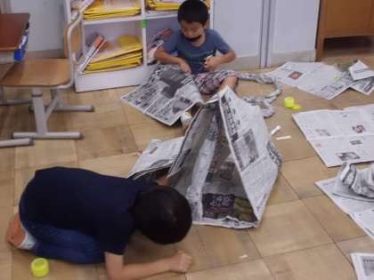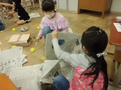 新聞紙をちぎったり,丸めたり,つなげたりして思い思いに活動しました。