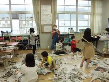 などと,互いに話をしたり一緒に活動したりしながら,新聞紙の感触を楽しみました。