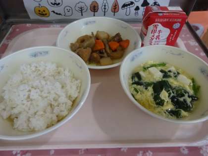 今日の給食は,麦ごはん・牛乳・筑前煮・かきたま汁でした。筑前煮は,福岡県の郷土料理で,がめ煮とも呼ばれます。秋が旬のごぼう,れんこんが使われていました。よく味が染みており,おいしくいただくことができました。かきたま汁は,卵がトロトロでした。その秘密は,あらかじめ片栗粉で汁にとろみをつけたところに卵を流すことです。そうすることで,卵が沈みにくくなりとろとろに仕上げられます。ご家庭でもぜひ試してみてください。