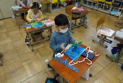 ハンガーに折り紙,色紙,PEテープなどの沢山の材料を,自分が表現したいものに合わせて選び工作しました。