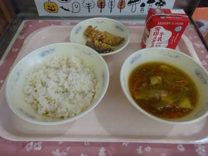 今日の給食は,麦ごはん・牛乳・カレーあんかけごはん(具)・とびうおのこはくあげでした。