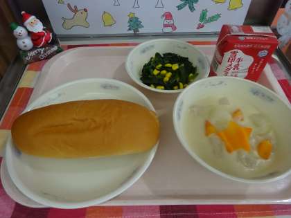 今日の給食は,味つけコッペパン・牛乳・だいこんのクリームシチュー・ほうれん草のソテーでした。