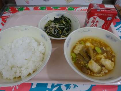 今日の給食は,ごはん・牛乳・とうふの四川風・ほうれん草ともやしのいためナムルでした。とうふの四川風は,トウバンジャンを使い少しピリッとした味です。子どもたちでも食べやすいように,トマトケチャップも調味料として使っています。