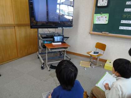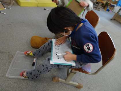「帽子をかぶってる!」「靴を履いてないよ。」と見つけて,ホワイトボードに書いて答えることができました。