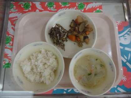 1月14日の給食は,なごみ献立でした。麦ごはん・煮しめ・ごまめ・京風みそ汁でした。