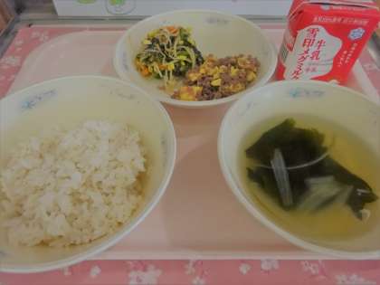 今日の給食は,麦ごはん・牛乳・ビビンバの具(肉とたまご)(ナムル)・わかめスープでした。