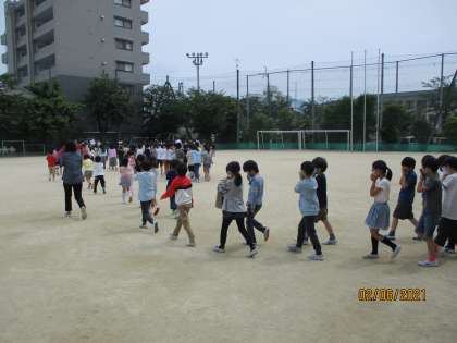避難訓練 公開日 2021/06/02 更新日 2021/06/02 学校の様子 今年度初めて,避難訓練を行いました。火災を想定した訓練です。 口にハンカチや手をあてて,煙を吸わないようにしながら,事前に確かめていた「お・は・し・も・て」の約束を守って,あわてず落ち着いて運動場へ避難することができました。 校長先生のお話にもあったように,自分の命を守るために,これからも本気で取り組んでほしいと思います。