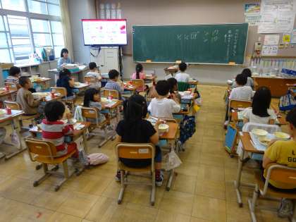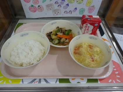 今日の給食は,ごはん・牛乳・焼肉・トマトと卵のスープでした。焼肉には,キャベツ・人参・たまねぎ・ピーマンが入っていました。トマトと卵のスープは,トマトの赤色,たまごの黄色で彩りよく,見た目にもおいしく食べられたようでした。