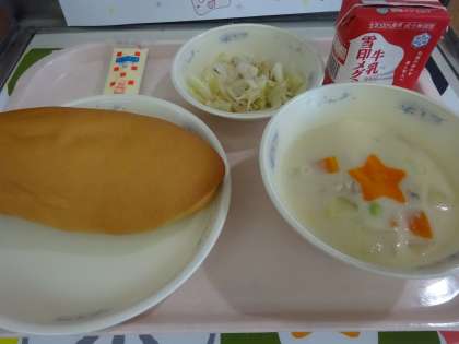 今日の給食は,コッペパン・牛乳・ツナサンド(具)・チャウダーでした。ツナサンドの具にマヨネーズを混ぜて,自分でコッペパンにはさんで食べるセルフサンドでした。
