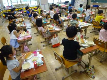1年生も,給食で初めてのセルフサンドでした。上手に具材をはさむことができていました。おいしくいただくことができました。