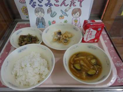 今日は,和食を味わう日「なごみ献立」でした。ごはん・牛乳・はものこはくあげ・伏見とうがらしのおかか煮・なすのみそ汁でした。