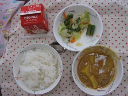 カレーは子どもにとても人気のあるメニューです。学校の給食室で小麦粉をいため,ルーを作ります。バターや脱脂粉乳,ヨーグルト,チーズなどいろいろなものが入っていてコクが出て本当においしいです。調理員さんは焦がさないように丁寧に長時間ルーをこねて作ってくださいます。カレーは家では比較的簡単な料理ですが,給食のメニューとしてはとても手入りな料理の一つです。感謝していただき,カレーの残菜はゼロです!!