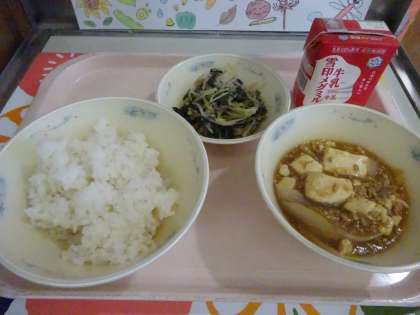 今日の給食は,ごはん(酒米)・牛乳・マーボどうふ・ほうれん草ともやしのいためナムルでした。