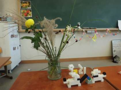 おひさま学級 「今日は中秋の名月です」 公開日 2021/09/21 更新日 2021/09/21 おひさま学級 今日は,中秋の名月です。おひさま学級で,月についての学習をしたり実際にススキや秋の植物を組み合わせ,実際に花ばさみを使って水切りをしながら一人ひとりお花を生けたりしました。最後に,お餅をついているうさぎや月,中秋の名月の日である日付をブロックで作り完成です!「お家に帰ったらお月さんを見てみよう」と子どもたちは話をしていました。