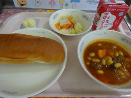 今日の給食は,ミルクコッペパン・牛乳・大豆と牛肉のトマト煮・野菜のホットマリネ・チーズでした。