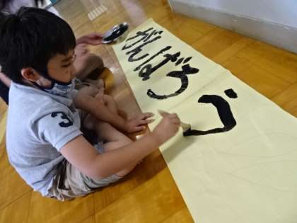 道徳の時間に,レインボーマン(上京支部の育成学級のキャラクターであり,おひさま学級の学習に,時々登場します。)からの手紙が届いたことを子どもたちに伝え,手紙を読みました。手紙の内容は,スポーツフェスティバルで新町小学校のみんなの気持ちが一つになるような言葉をおひさま学級のみんなで考え,大きな紙に書いて掲示をして欲しいという仕事内容の依頼でした。
