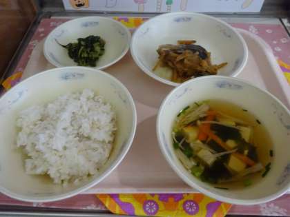 今日は,和食を味わう日「なごみ献立」の日でした。献立は,麦ごはん・さばのみそ煮・だいこん葉のごまいため・五色のすまし汁でした。