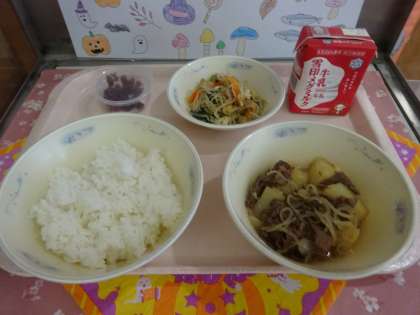 今日の給食は,ごはん・牛乳・肉じゃが・もやしの煮びたし・しば漬でした。