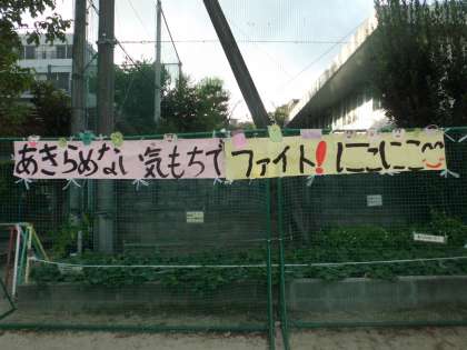 おひさま学級と1〜4年生は10月21日(木)に,スポーツフェスティバルを行います。新町小学校のみんなの気持ちが一つになるような言葉をおひさま学級のみんなで考え,大きな紙に筆で言葉を書きました。そしてその言葉の周りにみんなが元気になるようなイラストを描き,飾りました。本日,その掲示物が完成しました!運動場に掲示しています。