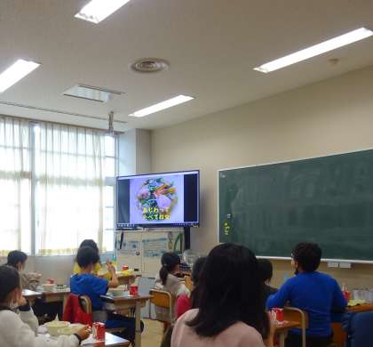 水菜を食べたときに「はりはり」と音がするからその名前がついています。つみれは,鶏肉・ツナ・細ねぎ・しょうがが入っています。給食室で,つみれを一つずつ丸めて作りました。その様子を,教室でムービーで見ました。手作りのよさを感じられたようでした。