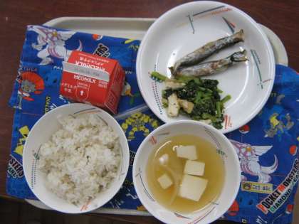 10月6日(木)  ししゃものからあげ 青菜の中華風炒め物 豆腐のスープ むぎごはん 牛乳