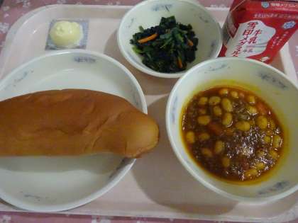 今日の献立は,黒糖コッペパン・牛乳・チリコンカーン・ほうれん草のソテー・チーズでした。チリコンカーンは,カレー粉でスパイシーに味をつけています。たっぷりの玉ねぎを,じっくり煮込んでいるのであまみもよくでていました。