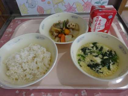 ★今日の玄米ごはんは,黄色と白色があってきれいでした。かきたま汁は,たまごがたっぷりでした。やさいもおいしかったです。私は,食べてうれしくなりました。いつも給食ありがとうございます。