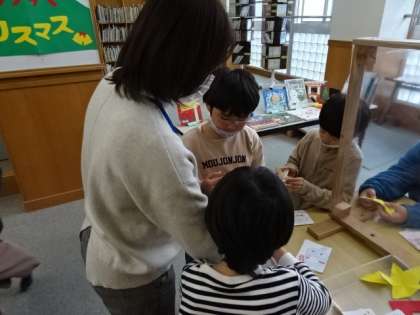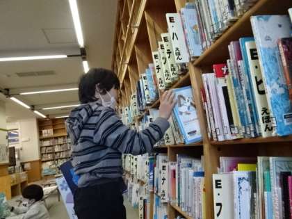 今回の仕事内容は,本の整理の仕事と季節の本をおひさま学級の子どもたちがセレクトして展示し,その本の周りに季節の飾りを子どもたちで作り,掲示を行うことでした。子ども同士で声を掛け合いながら協力して仕事を行っている様子が見られました。