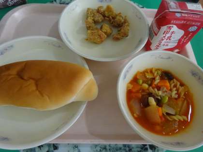 今日の給食は,ミルクコッペパン・牛乳・スパイシーチキン・ミネストローネでした。ミネストローネは,イタリアの料理です。イタリア語で「具だくさん」という意味があります。給食では,玉ねぎ・人参・ホールトマト・ベーコン・マカロニ・ミックスビーンズが入っていました。色とりどりでとてもきれいでした。