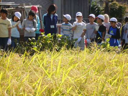 秋晴れの中,黄金に輝く稲を稲の指導をしていただいていた西村さんの指導の元,5年生全員で刈りました。一人3束ずつ鎌で刈り,それを1くくりにするのですが,くくるわらが切れたり,結び方がゆるくなったりして苦労していました。食育企画推進委員の方7名がかけつけてくださり,1くくりにするのを手伝ってもらったり,怪我をしないように見守っていただいたりして,やっと全部を刈る事ができました。お世話になりました。その後コンバインが登場し,脱穀を一人ひとり体験させていただきました。あっという間に脱穀ができるのでみんな驚いていました。