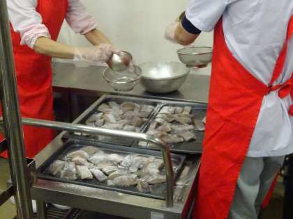 ほきのムニエルは,下味をつけたほきに米粉をふるい,スチコンで焼きました。トマトソースも手作りです。オレガノのいい香りがしました。ムニエルにトマトソースを付けながらいただきました。