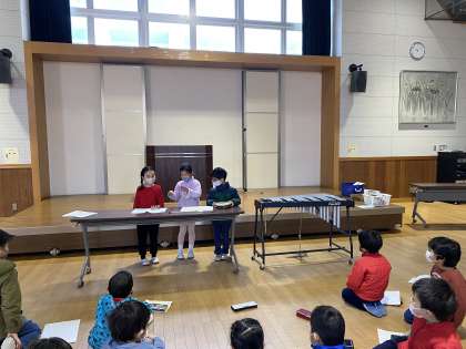 1年生は音楽で星空の様子を思い浮かべながら,鉄琴・トライアングル・すず・タンブリンを用いて音楽づくりの学習をしてきました。