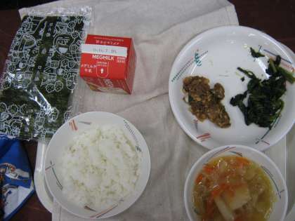 今日は新献立 肉味噌納豆です。納豆は苦手な児童も多いのでは、と思っていたのですが案外,「納豆大好き!」という子も多く,残菜はゼロでした。納豆と一緒に,牛ひき肉やたまねぎ,青ねぎを炒めて,さとうや赤味噌・トウバンジャンで味付けしてあり,納豆が苦手な児童もあまり気にならずに食べられたようです。ご飯と一緒にのりで巻いて楽しく食べていました。