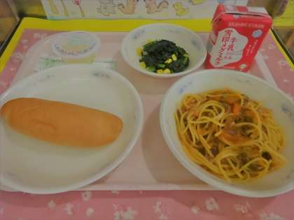 今年度の給食も今日からスタートしました。1年生の入学をお祝いする献立でした。小型コッペパン・牛乳・スパゲティのミートソース煮・ほうれん草のソテー・りんごゼリーでした。
