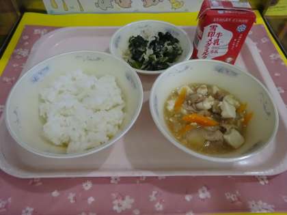 今日の給食は,ごはん・牛乳・五目どうふ・切干大根のいためナムルでした。五目どうふに使われていた玉ねぎは,春においしい新玉ねぎでした。あまみがよく出ており,やわらかいのが特徴です。