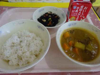 今日の給食は,麦ごはん・牛乳・カレー・ひじきのソテーでした。給食のカレーは,ルーから手作りです。バター・小麦粉などでルーを作り,大きな釜でじっくり煮込んだカレーは,絶品です。