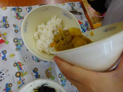 教室で,自分でごはんにカレーをかけていただきました。1年生のみなさんも,上手にかけることができました。スパイシーな香りが教室に広がっていました。今日もごちそうさまでした。