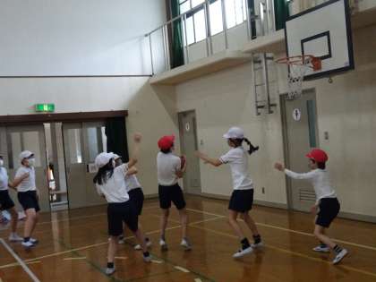 バスケットボールの学習をしています。対戦するチームに合わせて攻め方や守り方を工夫して取り組んでいますが,まずはしっかりボールを受けたり投げたりするところから頑張っています。