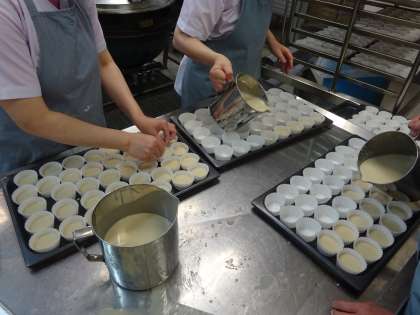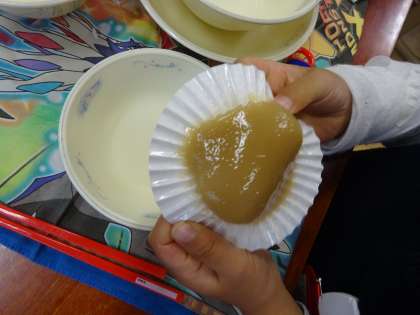 ういろうは,米粉・黒糖・砂糖を混ぜてスチームコンベクションオーブンで蒸して作りました。朝から子どもたちは「ういろうって何?」「ういろう楽しみです!」とわくわくしている様子でした。給食時間中には,ういろうについてのムービーを見て,味わって食べました。