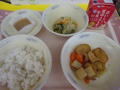 今日の給食は,麦ごはん・牛乳・平天とこんにゃくの煮つけ・切干大根の煮びたし・ういろうでした。