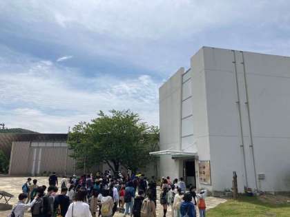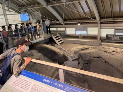 館長さんのお話を聞き、中へ入りました。断層の展示などを興味深く見学しています。