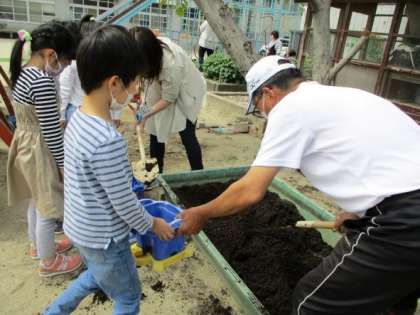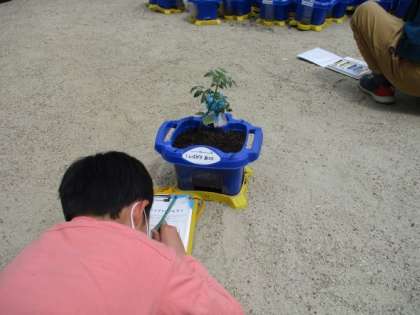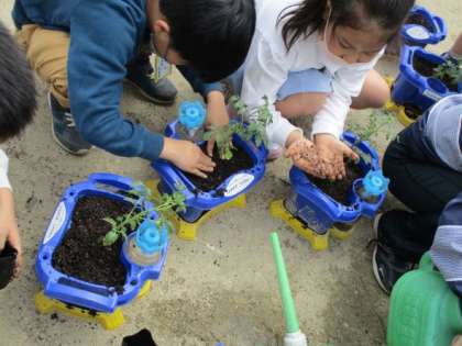 植えた苗を見て,「小さいミニトマトの赤ちゃんがいる。」「おいしくて大きいトマトに育ってほしい。」などと観察していました。