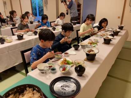 夕食タイムです。豪華なメニューでみんなニコニコです。たこめしもたくさんおかわりしています。