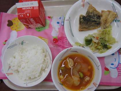 11月2日 あじのからあげ アスパラガスのソティ ソーセージと豆のトマトスープ ご飯 牛乳