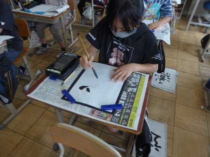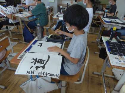 書写の学習に取り組みました。中や外の文字の組み立て方に意識して書きました。筆使いに気をつけながらしんにょうの書き方に気をつけて書きました。
