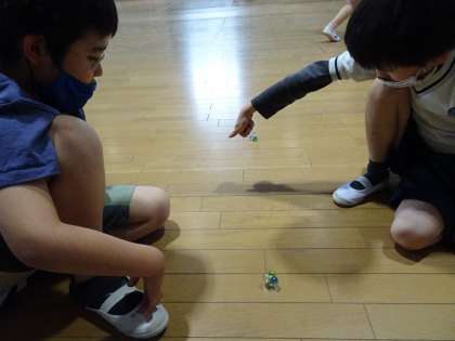 図工の時間に,ビー玉で作るコマを作りました。ビー玉を4つ組み合わせて作るコマで,コマを回すとひっくり返って回ります。「なんでひっくり返るのだろう?」と喜びながら子どもたちはコマを回していました。ビー玉なので,見ていてもきれいで何度も回したくなるコマが出来上がりました!
