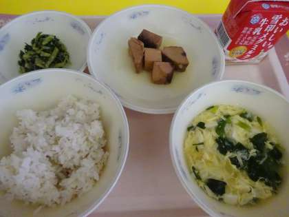 今日の給食は,麦ごはん・牛乳・なま節のしょうが煮・だいこん葉のごまいため・かきたま汁でした。