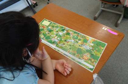 道徳の時間に,絵本『109ひきのどうぶつマラソン』(作・絵/のはなはるか)を使いながら授業を行いました。109匹のさまざまな動物たちがどうぶつマラソン大会を行います。ジャングルのコースや海のコース等いろいろなコースが登場します。授業では,さまざまなコースでがんばっている動物をみんなで見つけました。今日,初めて行った授業でしたが,子どもたちは楽しそうに学習する様子が見られました。