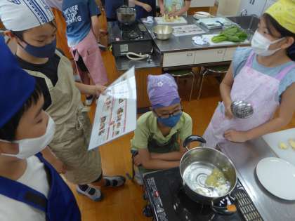 5年3組 家庭科〜調理実習〜 公開日 2022/06/02 更新日 2022/06/02 5年生のページ 今日は3組が調理実習でした。じゃがいもとほうれん草を調理しました。班で協力して作ることができおいしく食べました。今日したことを家庭でもいかしてくれるとうれしいです。