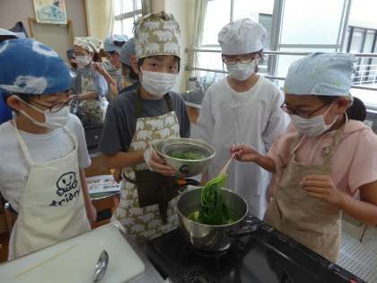 5年2組 家庭科〜調理実習〜 公開日 2022/06/03 更新日 2022/06/03 5年生のページ 今日は2組の調理実習でした。手際よく協力して作ることができました。おいしく作れたようでした。ぜひご家庭でも作って見てほしいと思います。